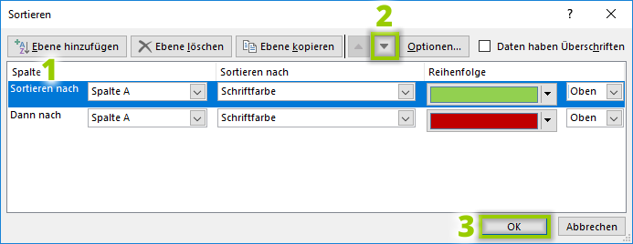 - In unserem Beispiel haben wir eingestellt, dass alle Zellen mit grüner Schrift nach ganz oben in der Tabelle geschoben werden sollen. Die Zellen mit roter Schrift kommen dann darunter. Wenn Sie keine weitere Ebene einfügen, positioniert Excel alle Zellen mit anderen Schriftfarben automatisch Excel an dritter Stelle.