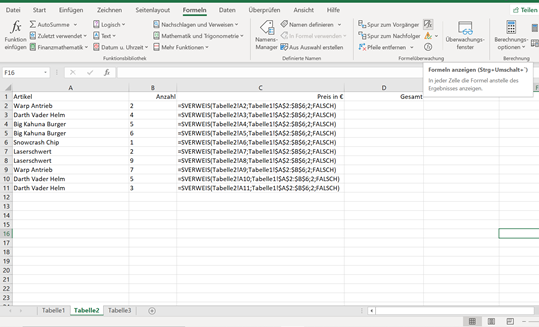 - Markieren Sie die Zelle C2 und wählen Sie (oben) den Reiter „Formeln“