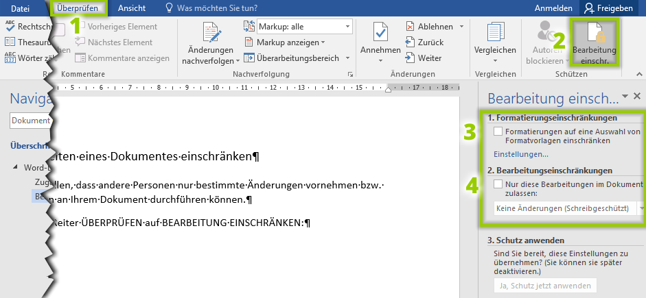 - Dort können Sie festlegen, dass andere Nutzer nur gewisse Formatvorlagen (3) verwenden dürfen oder nur bestimmte Handlungen durchführen können (4). Setzen Sie bei dem entsprechenden Punkt oder bei beiden ein Häkchen.