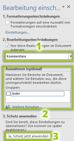 - Haben Sie im Feld „Bearbeitungseinschränkungen“ „Kommentare“ oder „Keine Änderungen (Schreibgeschützt)“ ausgewählt (1), können Sie einstellen, dass andere Personen nur bestimmte Bereiche in Ihrem Dokument verändern können.